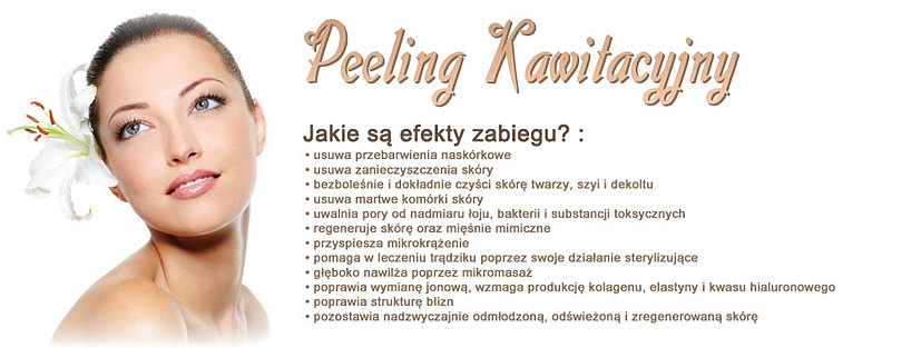 To zabieg polegający na oczyszczeniu skóry poprzez peeling ultradźwiękowy. Poza złuszczeniem, wibracje ultradźwiękowe, wzbogacone o mikromasaż, poprawiają mikrokrążenie i dotleniają skórę. Pobudza atywność komórkową oraz zwiększa penetrację substancji aktywnych w głab skóry. Oczyszcza pory i wygładza skórę, wzmacnia i uszczelnia naczynia włosowate, doskonale nawilża i stymujuje naturalne nawodnienie oraz zmiękcza naskórek. Działa kojąco i regenerująco na skórę. Peeling kawitacyjny jest bezbolesnym zabiegiem, przeznaczonym również dla osób, które mają wrażliwą skórę i nie mogą korzystać z oczyszczania manualnego. Jest cżesto wykorzystywany jako przygotowanie do dalszych zabiegów kosmetyczncyh.